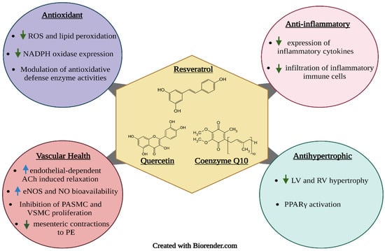 Proposed mechanisms of action of the bioactive phenolic compounds resveratrol, quercetin, and coenzyme Q10. Upward facing arrows indicate an increase in activity, while downward facing arrows indicate a decrease in activity.