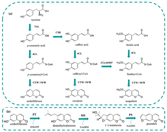 Coumarin’s biosynthetic pathway in Escherichia coli (a). Linear furanocoumarin’s pathway in plants (b). 4CL1: 4-coumarate-CoA ligase 1; C2′H: p-coumaroyl-CoA 2′-hydroxylase; C3H: 4-coumarate 3-hydroxylase; CCoAOMT: caffeoyl-CoA 3-O-methyltransferase; DMAPP: dimethylallylpyrophosphate; F6′H: feruloyl-CoA 6′-hydroxylase; MS: marmesin synthase; NADPH: nicotinamide adenine dinucleotide phosphate; PS: psoralen synthase; PT: prenyltransferase; TAL: tyrosine ammonia lyase.