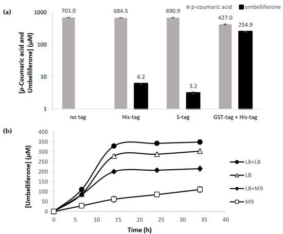 Umbelliferone production from p-coumaric acid using p-coumaroyl-CoA 2′-hydroxylase (C2′H) expressed with different tags (His-tag, S-tag, and GST-tag) (a) and using different culture media (LB + LB, LB, LB + M9, and M9) (b). p-Coumaric acid was added at a concentration of 0.7 mM (a) and 1 mM (b).