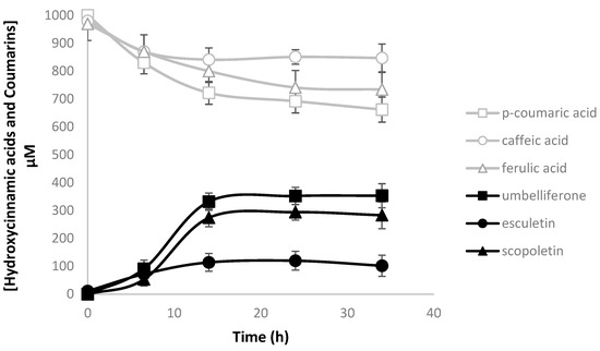 LB culture medium was used for plasmid propagation in E. coli BL21 (DE3) and for inoculums (200 rpm, 37 °C). For coumarin production, cultures were grown at 37 °C in 50 mL LB (250 mL flasks) from an optical density at 600 nm (OD600) of 0.1 to 0.6. Afterwards, the heterologous protein expression was induced with IPTG (0.1 mM final concentration), and the culture was incubated at 26 °C for 5 h. Then, the cells were collected by centrifugation and suspended in coumarin production medium (LB or M9 minimal medium). In two cases, cells were maintained in the same LB used for protein production or grew from the beginning in M9. IPTG (0.1 mM final concentration), precursors (p-coumaric acid, 0.7 mM–1 mM; caffeic acid, 1 mM; ferulic acid, 1 mM; or tyrosine, 3 mM) and antibiotics (ampicillin, 100 µg/mL; kanamycin, 50 µg/mL; spectinomycin, 100 µg/mL; and/or chloramphenicol, 25 µg/mL) were supplemented at time 0 depending on the specific experiment. M9 minimal medium contained (per L): 40 g glucose, 3 g KH2PO4, 6 g Na2HPO4, 0.5 g NaCl, 1 g NH4Cl, 110 mg MgSO4, 15 mg CaCl2, 340 mg thiamine and 5 g CaCO3. Vitamins (12.2 mg nicotinic acid, 10.8 mg pantothenic acid, 2.8 mg pyridoxine, 0.84 mg riboflavin, 0.12 mg biotin, and 0.084 mg folic acid) and trace elements (54 mg FeCl3, 4 mg NaMoO4, 4 mg ZnCl2, 4 mg CoCl2, 2 mg CuCl2, and 1 mg H2BO3) were also supplemented to M9.