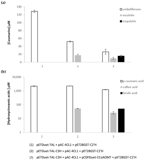 Coumarin production in Escherichia coli using tyrosine as precursor and different combinations of plasmids. Coumarins concentrations (a), hydroxycinammic acids concentrations (b). 4CL1: 4-coumarate-CoA ligase 1; C2′H: p-coumaroyl-CoA 2′-hydroxylase; C3H: 4-coumarate 3-hydroxylase; CCoAOMT: caffeoyl-CoA 3-O-methyltransferase; TAL: tyrosine ammonia lyase.