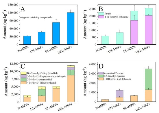 | Furans (2) | 600.96 ± 73.22 b | 842.49 ± 191.62 c | 2369.50 ± 398.75 a | 2565.21 ± 176.92 a | |||
