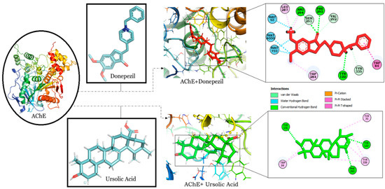 Molecular docking interaction models of AChE (PDB ID: 4PQE) with donepezil and ursolic acid. 2D structures of the compounds are shown by line and stick models with the surrounding amino acids of AChE. The interactions are denoted by the following colors: hydrogen bonding interactions (green), alkyl bonds (pink) and bumps (red). AChE; Acetylcholinesterase.