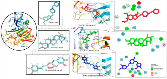 The current study was performed to elucidate the therapeutic potential of three major constituents of the polar nature of R. officinalis, i.e., RA (polyphenol), CA (labdane-type diterpene) and (UA) pentacyclic triterpenoid. Therefore, molecular docking was performed with these compounds to reveal their binding affinity and interaction with the target proteins of AD in comparison to donepezil.