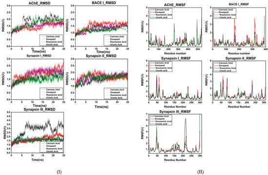 (I) RMSD plot of the bioactive compounds of R. officinalis with target proteins at 25 ns. (II) RMSF plot of AChE, BACE1, synapsin I, synapsin II and synapsin III with CA, RA, UA and donepezil respectively.