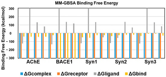 An energetic analysis was conducted to acquire the binding affinities using the MM/GBSA method with the protein–ligand complexes. The scores obtained from the MM/GBSA calculations are shown in Table 2. The overall binding free energies of the complexes of AChE with all the ligands was ~40 kcal/mol, expect for ursolic acid with = −43.7367 kcal/mol, which revealed the most stable complex following the measurement of the docking affinities trend, as shown in Figure 6.