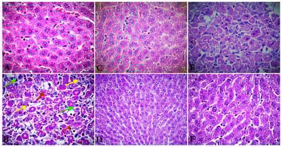 A representative photomicrograph of a section of the liver tissues of rats exposed to CCL4 (1.25 mg/kg BW) for 15 days, followed by silymarin (10 mg/kg BW) and extracted EO at two doses (5 and 10 mg/kg BW) for 15 days (E&F). Control rats ((A), 100 μm) show a normal architecture of hepatocytes and intact cell membrane. ((B), 100 μm) section of liver of rats treated by CCL4 shows altered hepatocyte morphology, with loss of cell membrane, increased nuclear size, and connective tissue infiltration with prominent necrosis and vacuoles. ((C), 100 μm) section of liver of rat’s vehicle-treated control exhibits normal architecture hepatocytes, intact cell membrane, and central vein. ((D), 100 μm) section of liver of rats treated by CCL4 (1.25 mg/kg BW) for 15 days and followed by silymarin for the next 15 days exhibits potent hepatoprotective activity with radially arranged hepatocytes similar to the control with intact cell membrane, as well as infiltration of cells formation of normal hepatic cards and absence of necrosis and vacuoles. ((E), 100 μm) section of liver of rats treated by CCL4 (1.25 mg/kg BW) and followed by extracted EO (5 mg/kg BW) exhibits moderate hepato-therapeutic activity with radially arranged hepatocytes similar to the control with intact cell membrane and infiltration of cells. ((F), 100 μm) section of liver of rats treated by CCL4 (1.25 mg/kg BW) and followed by extracted EO (10 mg/kg BW) exhibits highly hepato-therapeutic effect with radially arranged hepatocytes similar to the control and silymarin with intact cell membrane and infiltration of cells formation of normal hepatic cards, as well as absence of necrosis and vacuoles.
