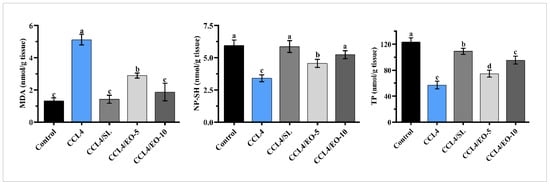 Effect of EO extracted from T. patula on MDA, TP, and NP-SH in liver of rats treated with CCL4. Data represented as mean ± SD (n = 6). CCL4: Carbon tetrachloride; SL: Silymarin; EO-5: Essential oil (5 mg/kg BW); EO-10: Essential oil (10 mg/kg BW); MDA: Malondialdehyde; TP: Total protein; NP-SH: Non-protein sulfhydryls. Different letters indicate statistically significant differences between groups at (p < 0.05).