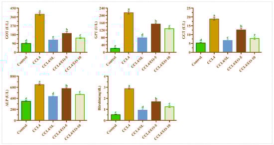 CCL4 induced pathologic changes in the liver, including hepatomegaly and serologic changes, along with increased activities of GOT, GPT, bilirubin, and GGT. Figure 6 shows that CCL4 treatment significantly (p < 0.05) increased the activities of GOT, GPT, GGT, and bilirubin, while the post-administration of EO (5 and 10 mg/kg BW) after CCL4 significantly (p < 0.05) mitigated these functional markers toward near-normal levels. T. patula EO at a dose of 10 mg/kg BW was more effective than the lowest dose of 5 mg/kg BW. A similar biological effect was noticed in rats treated with silymarin.
