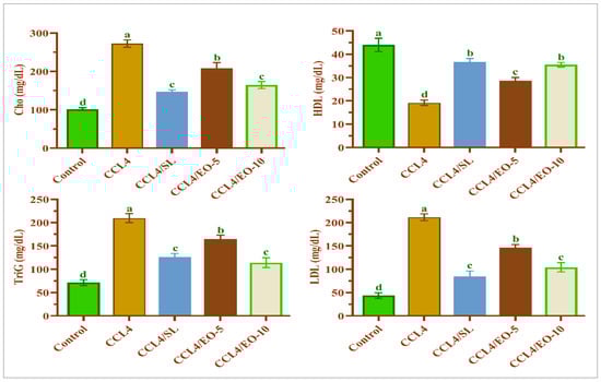 Effect of EO extracted from T. patula on lipid profile of rats treated with CCL4. Data represented as mean ± SD (n = 6). CCL4: Carbon tetrachloride; SL: Silymarin; EO-5: Essential oil (5 mg/kg BW); EO-10: Essential oil (10 mg/kg BW); Cho: Cholesterol; TriG: Triglycerides; HDL: High-density lipoprotein; LDL: Low-density lipoprotein. Different letters indicate statistically significant differences between groups at (p < 0.05).