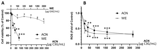 Anthocyanins in ACN and WE (dose range 20–320 µg C3G/mL) downregulated ROS production to 0.3 ± 0.07-fold and 0.33 ± 0.08-fold of untreated controls, respectively (Figure 1B). These results demonstrated that the anthocyanins present in both WE and ACN extracts decreased ROS, contributing to cell growth suppression.