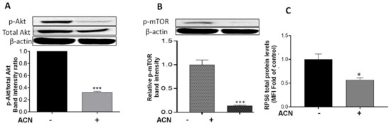 Results showed that Akt mRNA levels were not changed by ACN treatment (data not shown). However, ACN downregulated Akt protein activation by phosphorylation (Figure 4A). The Akt cell signaling downregulation was consistent with the lower p-Akt/total Akt protein ratio (Figure 4A, lower panel). Consistently, ACN downregulated mTOR phosphorylation (p-mTOR) (Figure 4B). Levels of full-length proteins within the PI3K/Akt/mTOR cell signaling pathway (illustrated in Supplementary Figure S2), assessed by multiplex immunoassays, remained without significant changes after ACN treatment for 24–48 h (Supplementary Table S1). Therefore, p-mTOR/total mTOR ratio decreased to 0.14-fold of untreated control (Supplementary Figure S3). RPS6 protein, also a downstream target of Akt (Figure S2), was downregulated by ACN treatment to 0.57 ± 0.08-fold of untreated control (Figure 4C).