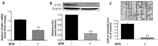 Vascular cell adhesion molecule (VCAM)-1 has been implicated in cancer cell migration in part due to its link to the Src signaling activation. Results demonstrated that ACN downregulated VCAM-1 at the gene expression level to 0.52-fold of untreated control (p = 0.0019) (Figure 5A). This was accompanied by suppression of p-Src (Figure 5B). An important role of Src is to increase the strength of cell–cell adhesion to promote collective cell migration closely related to the epithelial–mesenchymal transition. Accordingly, the anti-invasive potential of ACN was further confirmed by the cell wound healing assay. Results showed a reduction in the number of cells that invaded the wounded area to 11.4 ± 2.9% that of control (Figure 5C).