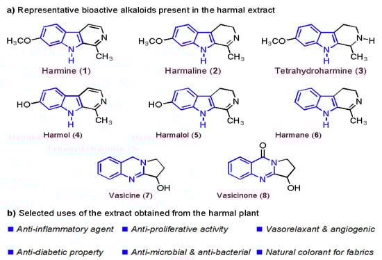 Peganum harmal plant is one of the pharmaceutically significant herbs that primarily grows in the Asian regions [21]. It has been traditionally utilized as a natural medicine for treating tumors, infections, and inflammations in Greek, Iranian, Indian, and Chinese nations [22]. The significance of this plant is owed to the presence of active alkaloids, as shown in Figure 1a, which are concentrated in the plant’s seeds and roots [23]. Both harmine (1) and harmaline (2) exhibit, more or less, similar pharmacological effects, yet the latter has relatively less toxicity. Moreover, other indoles, quinazoline, and quinazolinone-based alkaloids (3–8) were also found to be active components in the harmal extracts with substantial medicinal utilities [24]. Specifically, harmine alkaloid (1) possesses anti-diabetic properties and has been used as a traditional medicine to treat diabetes. While harmaline (2), harman, and harmalol alkaloids act as vasorelaxants and angiogenic inhibitors to treat many cardiovascular diseases, including hypertension and bradycardia [25,26,27]. The extract of the harmal plant has also been used as an analgesic medicine to treat severe pain [28] and Parkinson’s disease [29]. In addition, the extract has anti-hallucination, anti-excitation, and anti-depression activities [30]. These active alkaloids have antitumor activity owing to their anti-proliferative effects that reduce the growth of colon cancer cells [31,32]. Other bioactive properties of the harmal extract include its application as an efficient antimicrobial and antibacterial agent against several types of bacteria, such as Proteus vulgaris and Bacillus subtilis [33,34]. Harmane (6) and vasicine (7) showed the most acetylcholinesterase inhibitor effect and can be used to treat Alzheimer’s disease [35]. In terms of respiratory disorders, vasicine (7) and vasicinone (8) have been reported to inhibit cough due to their bronchodilation activity [36]. In addition, the extract is also used at an industrial scale as a natural colorant for fabrics, especially wool, silk, and cotton [37].