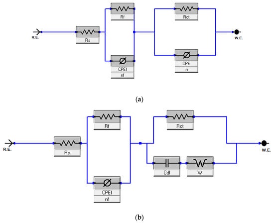 Equivalent circuits (a) Model 1 and (b) Model 2 used to fit the impedance data of the Harmal extracts.