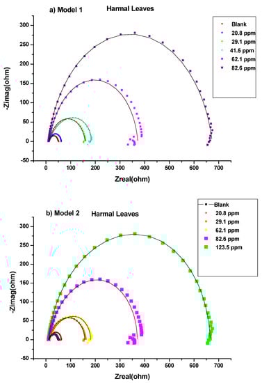 This study was performed to investigate the amount of current flow and the resistance values occurring on the carbon steel surface with and without the presence of inhibitors [52]. All the processes involved in the electrical response of the system were fitted against the equivalent electrical circuits (EEC) model 1 (Figure 2a) and model 2 (Figure 2b). Nyquist plots are shown in Figure 3 for HRE, Figure 4 for HLE, and Figure 5 for HFE, with (a) for the fitting by model 1 and (b) for the fitting by model 2.