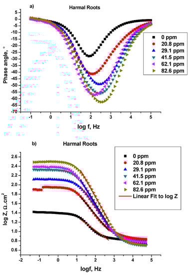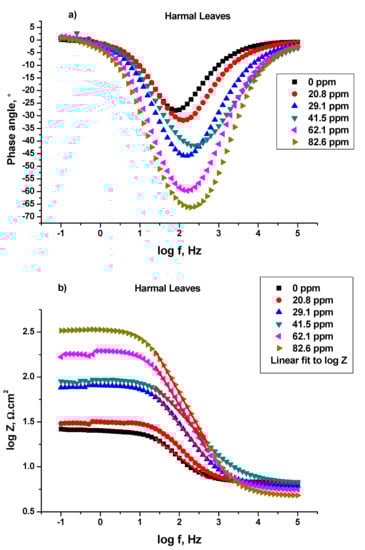 Bode and Bode phase plots: log (imaginary part of impedance) (log |Z| (ohm)), and phase angle (°) were plotted against log frequency (logf (Hz)) respectively, Figure 6, Figure 7 and Figure 8, for C-steel in 0.25 M H2SO4 in the absence and presence of Harmal extracts [41]. Figure 6a, 7a, and 8a show the log Bode phase angle (°) plotted against the logf (Hz) for the inhibitor HRE, HLE, and HFE, respectively.