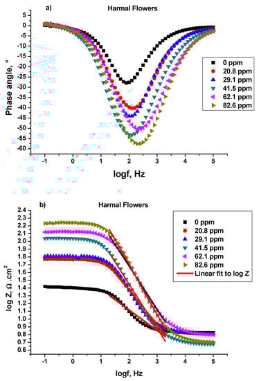 It is obvious that increasing the Harmal extract concentration causes more negative values of phase angle at the intermediate frequency (peak), and thus the inhibitive behavior increases [41,42]. In fact, the phase angle values increased from −27.87° for the blank solution to −62.52° (HRE), −66.28° (HLE), and −57.58° (HFE) for the inhibitor solution (82.6 ppm), Table 7.