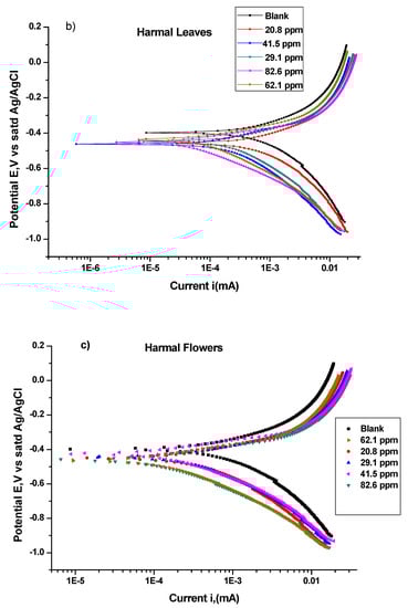 Figure 9a–c shows the Tafel polarization curves obtained for carbon steel in the absence and presence of Harmal part extracts roots, leaves, and flowers, respectively, in 0.25 M H2SO4 at room temperature.