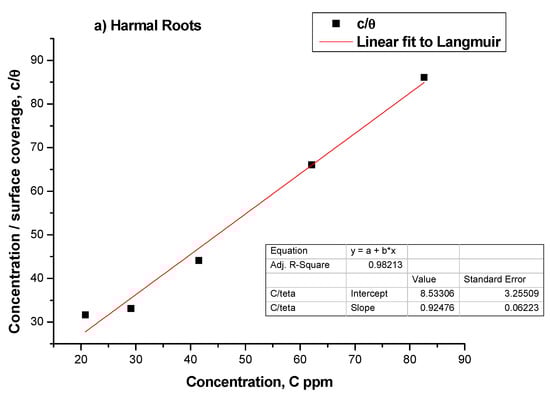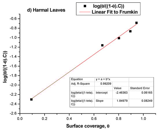 In order to study the adsorption behavior of Harmal extracts in H2SO4 solution, several isotherm models were implemented using the inhibition values obtained from polarization studies. These are Langmuir, Frumkin, and Temkin [41]. However, the best fit was obtained for the Langmuir isotherm model for all three extracts Figure 10a–c, and additionally, Frumkin also fitted the data of the HLE extract, Figure 10d.