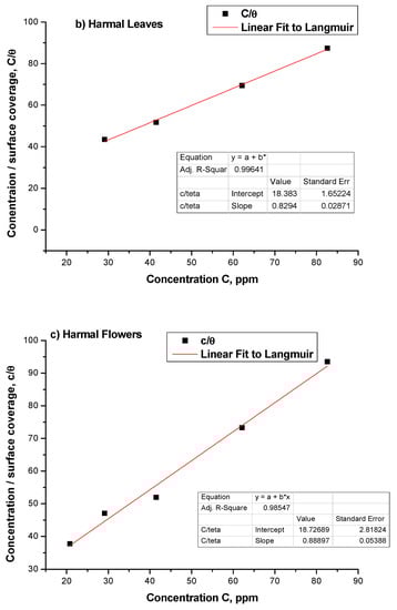 The adsorption parameters, regression coefficient R2, Kads, and slope values are obtained by straight line fitting between C/θ and C, Figure 10a (HRE), b (HLE), and c (HFE). The R2 coefficient values are all ≥0.98. It is obvious that the slope values are close to 1.0, as expected from the Langmuir model Equation. According to the Langmuir adsorption isotherm, the tested inhibitor molecules have a typical adsorption site at the metal/solution interface with no interaction with the other molecules adsorbed.