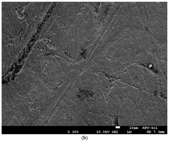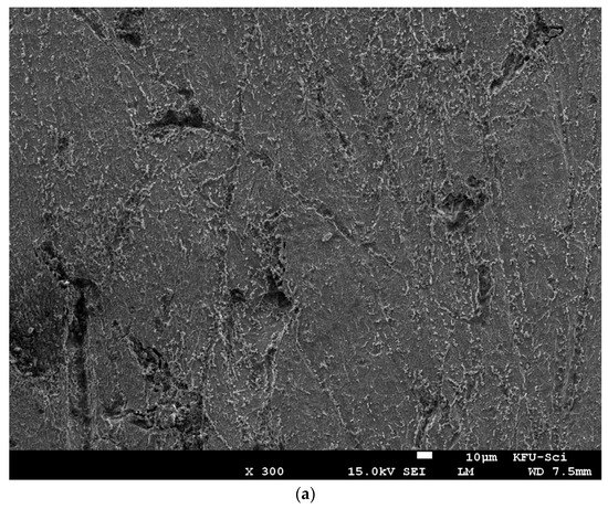Accordingly, the corrosion rate in mils penetration per year (mpy) decreased from 1554.0 for the blank solution to 63.34 for HRE, 86.1 for HLE, and 180.7 HFE extracts, at an 82.6 ppm inhibitor concentration. Again, the greatest decrease in corrosion rate also occurred for HRE, and the corrosion rate followed the order HRE < HLE < HFE. This indicated that the extracts’ organic constituents inhibited carbon steel’s corrosion process in a dilute H2SO4 solution. Moreover, it is clear from the Tafel plots in Figure 9a–c that the addition of an inhibitor effectively suppressed cathodic reactions. This suggests that Harmal extracts functioned as a cathodic inhibitor. In addition, the corrosion parameters such as Ecorr, Icorr, slope of anodic (βa) and cathodic (βc), and inhibition efficiency values are listed in Table 8, Table 9 and Table 10. The addition of inhibitor decreased the magnitude of βa and βc, indicating that the extracts acted as an anodic and cathodic inhibitor of mild steel samples in H2SO4 solutions [56].