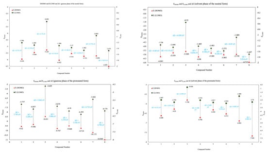 Comparative representation of EHOMO and ELUMO for the neutral and protonated forms of studied compounds 1–8 calculated in the gaseous and solvent phases using water and by applying PCM model at the B3LYP/6-311G++(d,p).