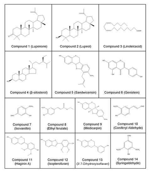 - Gfeller, D.; Grosdidier, A.; Wirth, M.; Daina, A.; Michielin, O.; Zoete, V. SwissTargetPrediction: A web server for target prediction of bioactive small molecules. Nucleic Acids Res. 2014, 42, W32–W38. [Google Scholar] [CrossRef] [PubMed]