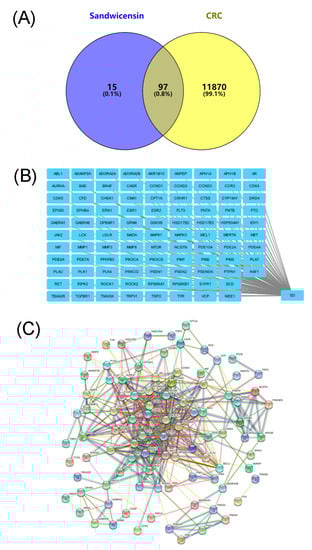 2.5. PPI Network Analysis of Target Proteins of Sandwicensin in CRC