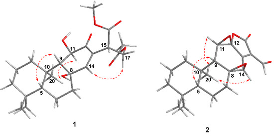 Detailed 2D-NMR (1H-1H COSY, HSQC, HMBC and NOESY) data analysis further confirmed the above deduction and fulfilled the structural assignment. The 1H-1H COSY revealed four spin systems, CH2-1/CH2-2/CH2-3, H-5/CH2-6/CH2-7, H-9/H-11 and H-15/CH2-17 (Figure 2). HMBC correlations from H3-20 (to C-1 and C-10), H2-1 (to C-9), H3-18 (to C-3, C-4 and C-5), H2-6 (to C-4 and C-10), H-11 (to C-8 and C-13) and H-14 (to C-7, C-9 and C-12) to their corresponding carbons not only connected the former three fragments, but suggested that compound 2 shared the same ABC rings with methyl-8β,11β-dihydroxy-12-oxo-ent-abietadi-13,15(17)-ene-16-oate. In addition, HMBC correlations from H-15 to C-12, C-13 and C-14 and from H2-17 to C-13 located the Δ15(17) double bond at C-13. HMBC correlations from the methoxyl group to C-16 suggested the presence of a methoxyformyl group, while the HMBC correlation from H2-17 to C-16 revealed its position at C-15. The acetoxyl group was connected to the abietane skeleton at C-17 by the key HMBC cross-peaks from H2-17 and H3-2′ to C-1′. Thus, the gross structure of 1 was established as depicted.