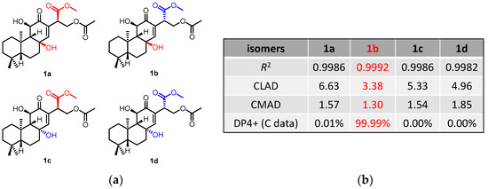 The NOESY correlations (Figure 3) of H-5/H-9 indicated that these protons were cofacial and were arbitrarily assigned to be β-oriented, while the NOESY correlation of H3-20/H-11 indicated that these protons were α-oriented. However, the NOESY spectrum did not give useful signals to determine the relative configuration of C-8 and C-15. To establish the relative configuration, the chemical shifts of four conformers were predicted at the B3LYP/6-311+G (d, p) level in chloroform (Figure 4). The results showed that the calculated chemical shifts of conformer 1b was in the best agreement with the experimental values among those predicted for 1a, 1b, 1c and 1d. Further DP4+ analyses verified that conformer 1b was assigned with a 99.99% probability among all the conformers (Figure 4). These results suggested that compound 1 had the structure of conformer 1b with the relative stereochemistry of 5R*, 8R*, 9R*, 10R*, 11R*, 15S*.