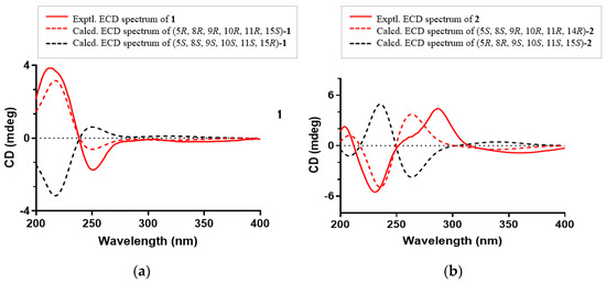 (a) Experimental and calculated ECD spectra of 1; (b) Experimental and calculated ECD spectra of 2.