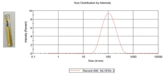 AgNPs preparation followed the chemical reduction method using a AgNO3 aqueous solution as a seed, followed by utilizing tri-sodium citrate (Na3C6H5O7) as a reducing and capping agent. The reaction was performed at a high temperature to enhance the uniformity of the resulting AgNPs size. AgNPs showed maximum absorption at 431 nm. The resulting NPs had a concentration of 16 μg/mL and show an average size of 80 nm, as measured by dynamic light scattering (DLS) as shown in Figure 1.