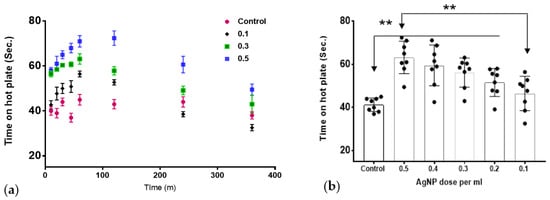 The test was performed to detect the difference in response to heat between the AgNPs-treated rats and control rats. As shown in Figure 2a, the animals showed a higher tolerance to heat when treated with AgNPs compared to the control group. The effect was dose-dependent and peaks at around one hour after injection. The effect of the AgNPs was reversed and the animals showed a downward slope towards normal heat sensitivity at 4–6 h. Figure 2b shows the overall average difference for all the tested time points.
