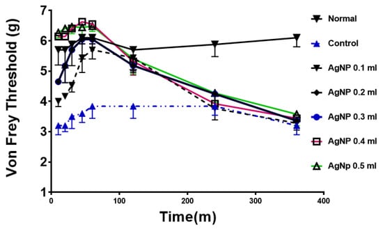 The test was performed to test the effect of AgNPs on a model of chronic pain (chronic constriction injury model). Normal animals (prior to sciatic nerve ligation) show a high and consistent threshold to von Frey filaments. The control group (after surgery) shows a much lower threshold, consistent with hyperalgesia as a result of mechanical allodynia. Treatment with various doses of AgNPs (0.1 mL to 0.5 mL) showed a similar dose response towards normalizing the von Frey threshold. The effect is both time- and dose-dependent, as shown in Figure 3.