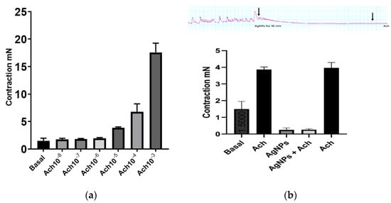 Ach at 10−5 M was unable to induce any change in muscle strip tone after 10 min incubation with AgNPs (Figure 4b). Interestingly, a test dose of Ach produced normal contraction after washing the organ bath three times, indicating that the muscle strips were viable and that reversible effect was due to the incubation with AgNPs.
