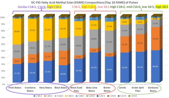 The FA compositions presented here, determined using basic (KOH) FAME derivatization, included the contributions from TAG and PL, as well as small amounts of other lipid components, though not free FA, which are presumed to be minor. Reports on kidney beans [13] and peas [12] showed that although their FA compositions were similar for most FA, they differed in the relative amounts of 16:0 and 18:3. In future work, we will add a class separation to examine the TAG and PL FA compositions of pulse samples separately.