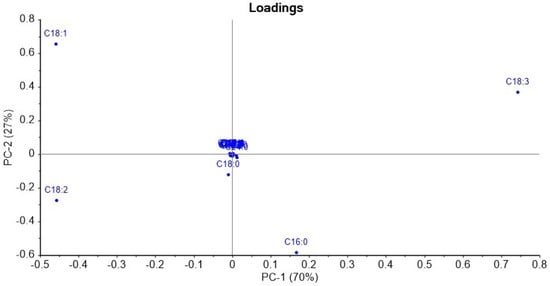 The loadings plot in Figure 3 indicated that the 18:3 FA relative percentage strongly influenced PC-1 and was positively correlated with it. Because of this, 18:3 was chosen as the basis for sorting in Figure 1. The 18:1 and 18:2 relative percentages also contributed to PC-1, but they were negatively correlated with it. The 16:0 relative percentage had the weakest influence on PC-1 of the four major FA and was positively correlated with it.