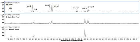 Partial FID chromatograms including the peaks for oxygenated FAME observed for lentils, black-eyed peas, and cranberry beans are shown in Figure 5. The oxygenated FAME eluted toward the end of the chromatographic runs, well separated from the non-oxygenated 18:1, 18:2, and 18:3 FAME peaks. An oxygenated FAME corresponding to 18:1, labeled as oxo-O in Figure 1, had a RT just before that of the FAME of 26:0, the latest eluting of the FAME listed in Table 1. Two oxygenated FAME corresponding to 18:2, labeled oxo-L1 and oxo-L2, eluted close together a couple of minutes after oxo-O, and two oxygenated FAME corresponding to 18:3, labeled oxo-Ln1 and oxo-Ln2, eluted close together several minutes later. A sixth late eluting peak, eluted between the oxo-L and oxo-Ln peaks, but closer to the latter, was also observed and can be seen in Figure 1. The PCI-CH4 signal from this peak was not strong enough to confirm its identity as an oxygenated FAME, but from its position in the chromatograms, it may be a third oxo-Ln isomer. Observation of a single oxo-O isomer, two oxo-L isomers, and three oxo-Ln isomers would be consistent with the numbers of isomers expected from epoxide formation at the carbon-carbon double bond sites of O, L, and Ln, by far the most abundant 18:1, 18:2, and 18:3 isomers, respectively, in the samples.