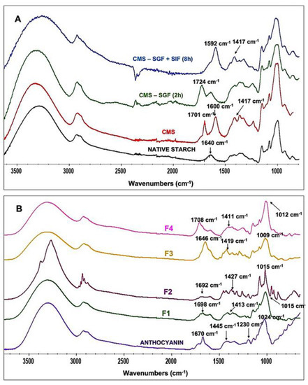 FTIR spectra of (A) native starch, CMS, CMS tablets dry, incubated in SGF (pH = 1.2) for 2 h and in SGF followed by SIF (pH = 6.8) for additional 6 h and (B) anthocyanin extract and tablet formulations F1, F2, F3 and F4.