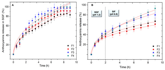 The ACNs’ release from F1, F2, F3 and F4 tablets was evaluated in SGF (pH = 1.2), and in SGF followed by SIF (pH = 6.8) to simulate the gastric and intestinal residence (Figure 4). The detailed composition of the tablets F1, F2, F3 and F4 can be found in Table S1 of the Supplementary Data.