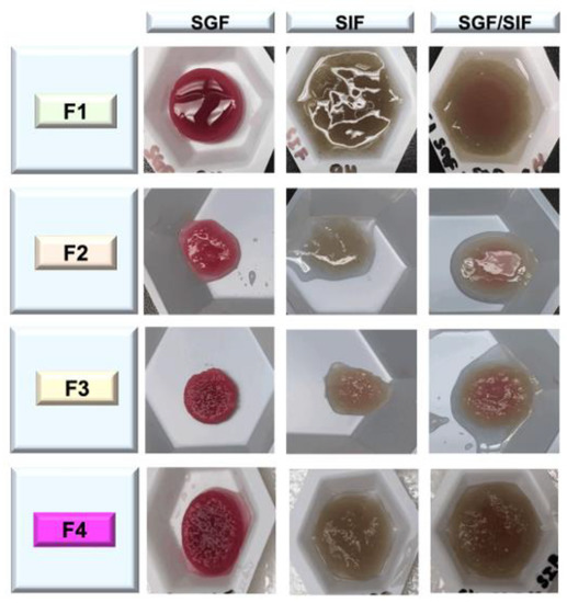 Physical features of the tablets after dissolution in SGF (pH = 1.2), in SIF (pH = 6.8), and in SGF (2 h)/SIF (7 h) at 37 °C.