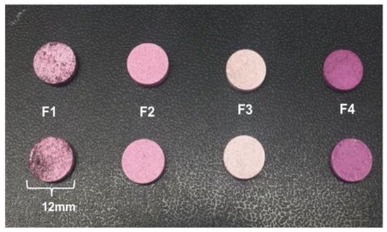 The four formulations F1, F2, F3 and F4 were prepared according to the compositions presented in Table S1. F1 tablets were obtained by direct compression of ACNs and CMS dried powders in equal proportion. For F2 and F3 tablets, CMS was mixed with ACNs:Man or ACNs:PVP anthocyanin powders, respectively, in the same proportions. The F4 tablets were produced using the ACNs:CMS powder described in Section 3.4.1.