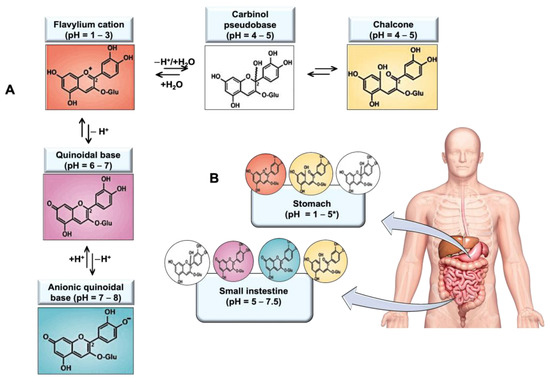 Representation of (A) ACN pH-dependent species and (B) their distribution according to the pH of the gastrointestinal tract. * The pH ranges from fasting to postprandial were considered. Adapted from Crozier et al. [14] and from Castañeda-Ovando et al. [16].