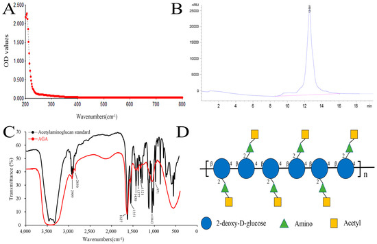 In this paper, a low molecular weight acetylaminoglucan (AGA) was extracted. We obtained 56 g of AGA by extraction and purification of 100 g of crude chitosan with a yield of 56%. The purity and characteristic functional groups of AGA were detected by UV spectrum analyzer, high performance liquid chromatography and FT-IR detection. A260 nm and A280 nm are the absorption wavelengths of the highest absorption peaks of nucleic acids and proteins, respectively. A smooth curve was observed in the UV spectrum of AGA, with no light absorption at 260 nm and 280 nm, indicating that AGA does not contain nucleic acids and proteins (Figure 1A) [27]. A single peak retention time of 12.582 min was observed from HPLC, showing a single symmetrical narrow peak, indicating that AGA is a small molecular polysaccharide with uniform molecular weight (Figure 1B Regression equation (Rt) was established according to molecular weight (Mw) and corresponding retention time: y = 0.3286x + 9.2747, R2 = 0.9990 (y = Ig Mw, x = Rt), the calculated molecular weight of AGA was 2.76 × 103 Da.