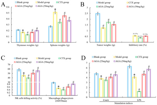 Antitumor effects of AGA in vivo. Immune organ indices (A) and tumor inhibitory rate (B). NK cell killing activity, macrophage pinocytosis (C), and splenic lymphocyte proliferation activities (D). * p < 0.05, compared with Blank group; # p < 0.05, compared with Model group.