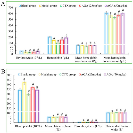 The blood cytokines detections of AGA on H22 tumor bearing mice. (A) Erythrocytes, hemoglobin, and proportion of mean hemoglobin. (B) Mean platelet volume, number, volume and distribution width. * p < 0.05, compared with Blank group; # p < 0.05, compared with Model group.