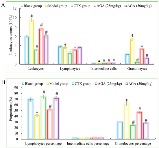 The leucocyte system counts (A) and its proportions (B) detections of AGA on H22 tumor bearing mice. * p < 0.05, compared with Blank group; # p < 0.05, compared with Model group.