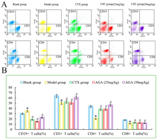 As could be seen from Figure 5, compared with the blank group, CD3+, CD4+ and CD8+ cells in the model group were significantly reduced, while CD19+ was significantly increased (p < 0.05), which were all characteristics of T lymphocyte subsets in peripheral blood of malignant tumor, indicating that the immune function of mice in the model group was immunosuppressed. The ability of the host to recognize and kill mutant cells decreases, and tumor growth and metastasis occur. CTX group showed that CTX treatment could inhibit the growth and proliferation of tumor cells in mice [43]. Compared with model group, CD3+, CD4+ and CD8+ cells in dose group were significantly increased, while CD19+ was significantly decreased (p < 0.05), suggesting that AGA can improve the immune function of H22 tumor-bearing mice, improve the recognition of cytotoxicity in mice, and finally achieve the objective of inhibiting the growth of H22 cells in vivo [44].