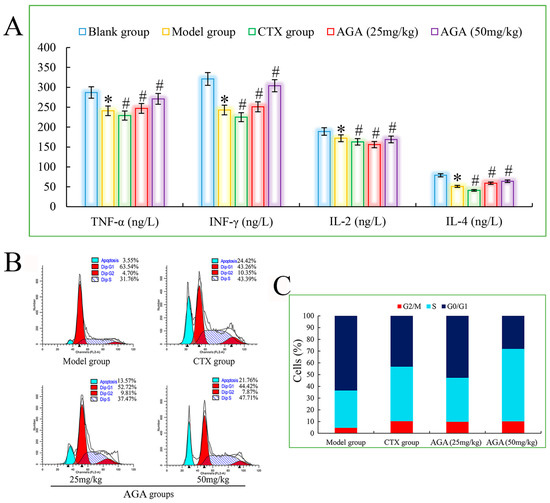 IL-2 has an important role in the immune response of the body and antiviral infection, etc. IL-4 has immunomodulatory effects on B cells, T cells, mast cells, macrophages and hematopoietic cells. IFN-γ is a highly potent antiviral bioactive substance with broad immunomodulatory effects. Therefore, assaying the biological activity of cytokines is an important step in exploring the anti-tumor immune effects induced by AGA in H22 tumor-bearing mice [46]. As shown in Figure 6A, the levels of TNF-α, IL-2, IL-4 and IFN-γ in the model group were significantly decreased compared with the blank group (p < 0.05), and the levels of all cytokines in the dose groups were significantly increased compared with the model group (p < 0.05) in a dose-dependent manner. At the same time, the mice in the CTX group had the lowest cytokine levels, suggesting that CTX exerts some toxic side effects on the immune system of the mice. All the above results suggest that AGA can inhibit the proliferation of H22 tumor cells and promote the secretion of various cytokines in vivo to improve the body immunity [47].